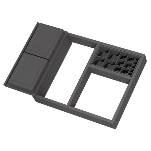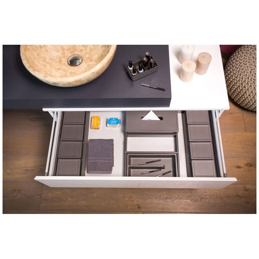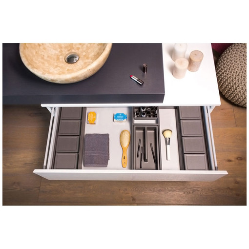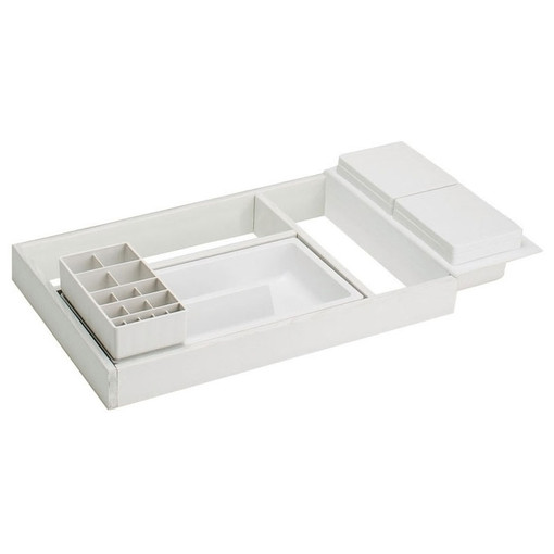 Idéal pour léquipement des tiroirs de salle de bain ou de dressing.Largeur extensible. Hauteur d encombrement mini 70mm, maxi 90mm.Cadre et accessoires en plastique.Le bac range cosmétiques peut être posé et coulisser sur le bac porte objets.Le choix d accessoires et leur nombre varient suivant la dimension du module.Accessoires disponibles suivant taille du module :- 1 cadre hauteur 69mm et longueur extensible de 70mm.- 1 bac d extrémité hauteur 53mm.- 2 ou 4 boites avec couvercle 114mmx90mmx65mm.- 1 bac range cosmétiques 138mmx73mmx40mm.Et suivant version :- 1 bac porte objets longueur 270mm, largeur 140mm, hauteur 40mm.- 1 distributeur à mouchoirs longueur 288mm, largeur 158mm, hauteur 90mm.