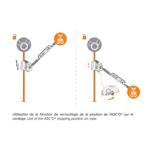 Sa position sur le cordage peut être bloquée grâce à un bouton de verrouillage, permettant ainsi de travailler sur une zone les mains libres.