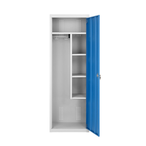 Construction monobloc en tôle d'acier Corps et portes d'épaisseur 7/10e Fermeture 1 point par serrure à clés Plaque de renfort intérieure autour de l'empreinte de la serrure 1 étagère sur toute la largeur en partie haute de l'armoire 1 partie à gauche pour rangement grande hauteur (balais, aspirateurs...) 1 tringle en PVC munie de 2 crochets double-tête, Ø20 mm 1 partie à droite avec 3 étagères dont 2 réglables au pas de 35 mm Charge maxi 45 kg/étagère uniformément répartie Double renfo [...]