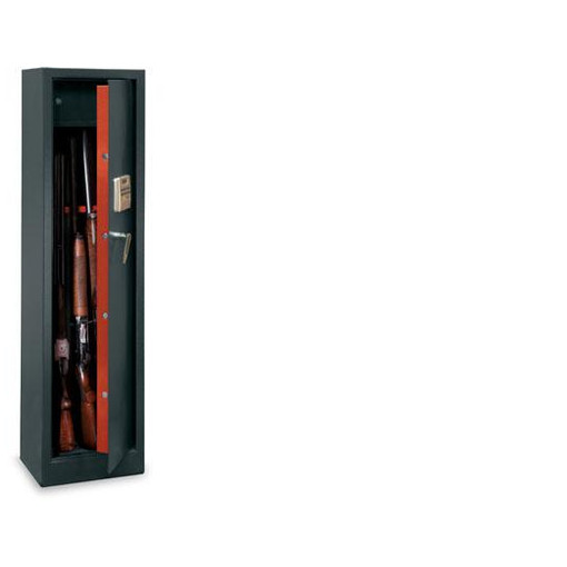 Pour le stockage de 5 fusilsstructure en acier monobloc d'épaisseur 2 mm et porte 3 mmépaisseur totale de la porte avec serrurerie : 55 mmserrure contrôlée par un système électronique à mémoire permanente4 pênes en acier chromé Ø 20 mmclavier à boutons poussoirs en ABS spécialalimentation par 4 piles de 1,5V (fournies)coffret intérieur pour munitions avec fermetures à clétrous pour fixation au dos et à la base (2 + 2) secours par clé d'urgence à double panneton haute sécurité (2 clés [...]