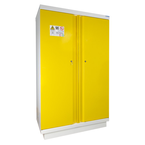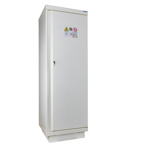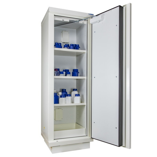 Pour produits inflammables Résistance au feu de 105 minutes selon la courbe normalisée ISO 834. Poignée sur toute la hauteur de l'armoire Piètement permettant un déplacement par transpalette Construction triple-paroi : parois extérieures en acier 12/10ème recouvertes de peinture époxy blanche RAL 9010, parois intérieures en mélaminé blanc RAL 9010. Bac de rétention amovible en partie basse. Signalisation par symboles normalisés. Etagères de rétention réglables au pas de 6,4 cm. Orifices d [...]
