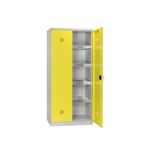 Construction monobloc en tôle d'acier, corps et portes 7/10e fermeture 2 points avec poignée encastrée - serrure à clés bacs de rétention en acier galvanisé, réglables au pas de 35 mm ergots d'accrochage sur les parois pour assembler les taquets charge maxi : 60 kg/bac porte double battants à recouvrement aérations par perforations sur les portes (35 cm2/porte) double renfort de porte vertical toute hauteur ouverture des portes à 180° peinture époxy durable et résistante aux chocs. [...]