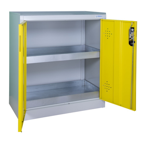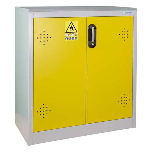 Pour le stockage des produits dangereux.Construction en acier monobloc, peinture époy coloris corps gris RAL 7035, porte jaune RAL 1023.Livrée avec 4 pictogrammes : "Corrosifs" (x2), "Toxiques" et "Inflammables" (à apposer selon votre utilisation).Plan de travail des armoires comptoirs (AZ50 et AZ110) recouverts d'un tapis caoutchouc.Orifices de ventilation haut et bas au niveau des portes.Portes battantes avec angle d'ouverture de 110°.Fermeture à clef en 3 points.Étagères/bacs de rétention d'une [...]