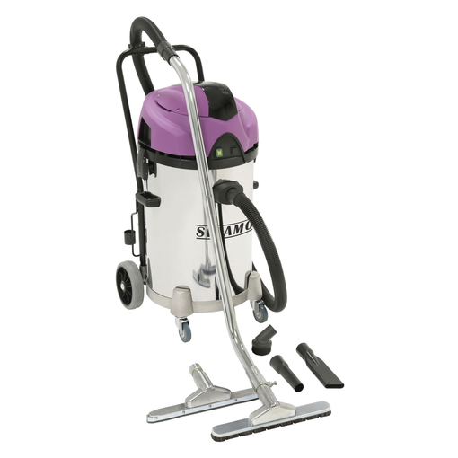 Système de décolmatage manuel du filtre par simple bouton moteur à refroidissement de type by-pass filtre cartouche classe M haute efficacité à 99,9 % en PET résistant à l'eau rangement accessoires intégrés dans la base flexible armé anti-écrasement aspiration bi-turbine plaque anti électricité statique reliée à la prise de terre équipement : 2 tubes coudés 500 mm Ø 40 mm, flexible 2,5m Ø 40 mm, suceur à poussières 400 mm, suceur liquide 400 mm, brosse ronde, suceur plat, connecteur [...]