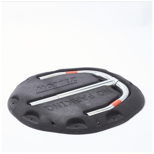 barrière de parking sur socle autoportant en caoutchouc moulé. Fermeture par serrure canon européen avec deux clés