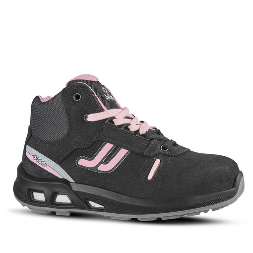 Chaussure de sécurité montante femme. Confort et Protection : Technologie anti-fatigue, semelle J-Energy avec insert Infinergy® pour un meilleur amorti et un retour d'énergie optimisé. Sécurité optimale : Norme ESD (EN 61340) contre les décharges électrostatiques. Embout en aluminium et intercalaire FleXtane 100 % composite, léger et isolant thermique. Design et Matériaux : Tige en cuir nubuck (noir & rose), doublure respirante 3D SURF, laçage rapide avec double jeu de lacets (noir et rose). [...]