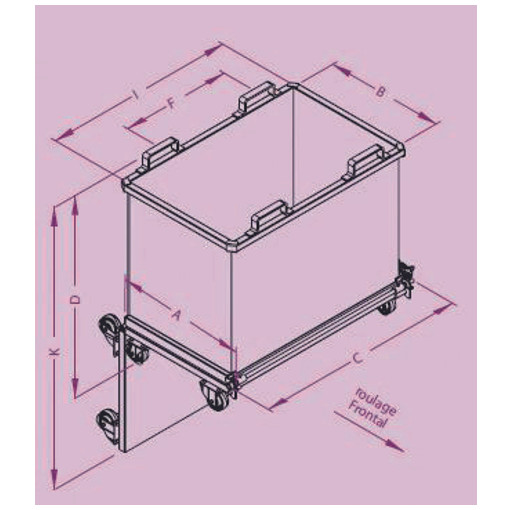 Caisse en tôle pliée 20/10ème avec rebord 3 plis anti-coupure et angles de renfort ceinture supérieure renforcée par rebord 3 plis anti-coupure verrouillage du fond par ensembles crochet/ressort articulés sur axe et bagues avec graisseurs déclenchement manuel par levier goupille de sécurité évitant tout déclenchement intempestif prise fourches supérieure dans boucles section int. 200 x 80 modèle sur socle avec prise transpalette modèle sur roues équipé de 2 fixes et 2 pivotantes Ø 125 Ny [...]