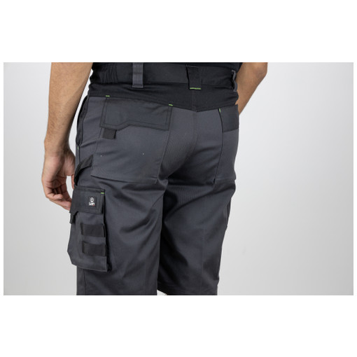 Composition : Sergé 60% coton 38% polyester 2% élasthanne - 280 g/m2 Oxford 300D imperméable 100% polyester - 175 g/m2 Bouton semi caché Ceinture élastiquée côtés 5 passants Large passant milieu dos Zip injecté braguette Poches italiennes, entrée de poche renforcée en Oxford Poche à soufflet, plaquée cuisse gauche, avec rabat fermé par bande auto-agrippante Système porte outils 2 poches dos à soufflet (dont une avec rabat), fermées par bandes auto-agrippantes Sangle porte marteau Poche m [...]