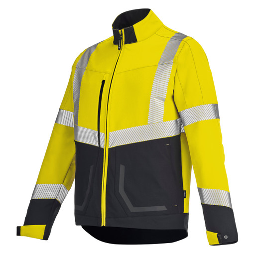 Col montant contrasté avec mentonnière. Devant fermé par fermeture à glissière sous double lèvres. Poche poitrine fermée par fermeture à glissière. Poche intérieure plaquée fermée par auto-agrippant. Poches basses fermées par fermeture à glissière et soulignées avec bande effet mat. Bandes rétro-réfléchissantes thermocollées de 50mm. Découpe dos. Ceinture dépassante. Bas de manches fermés par grippers. Tissu fluo : 94% polyester recyclé 6% élasthanne - 280 g/m². Tissu contraste [...]