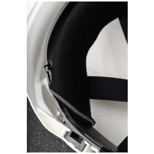 EN 397:2012 +A1:2012. Coiffe en ABS, harnais en polyéthylène 6 points avec 6 bandeaux textile, réglage par crémaillère de 52 à 63cm, aérations latérales, visière courte, lunettes de sécurité intégrées avec traitement anti-rayure normé K et anti-buée normé N, fentes latérales, basane en textile 3D, jugulaire 4 points fournie avec le casque. Grande résistance (déformation latérale (LD), projection de métal en fusion (MM), faible températures -30°C). Coiffe en ABS. Classe 0 : isolatio [...]