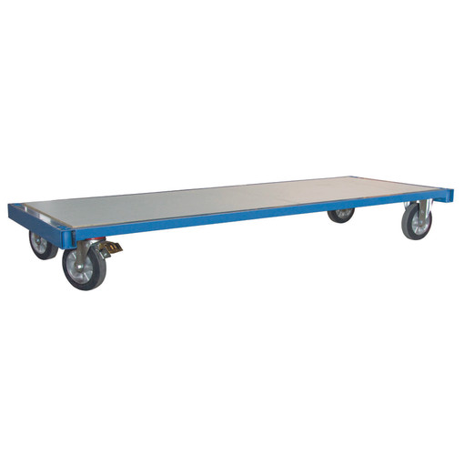 Strcuture en acier mécanosoudé Chariot modulaire extrêmement robuste destiné à des utilisations intensives dans l'industrie plateforme renforcée équipée d'un panneau bois épaisseur 19 mm antidérapant et imputrescible roues Ø 200 mm, 2 fixes + 2 pivotantes à frein, corps alu monté sur roulement à billes positionnement des roues rectangle pour une excellente tenue en ligne droite et courbe les dossiers et ridelles hauteur 700 mm peuvent être positionnés indépendamment en fonction des besoi [...]