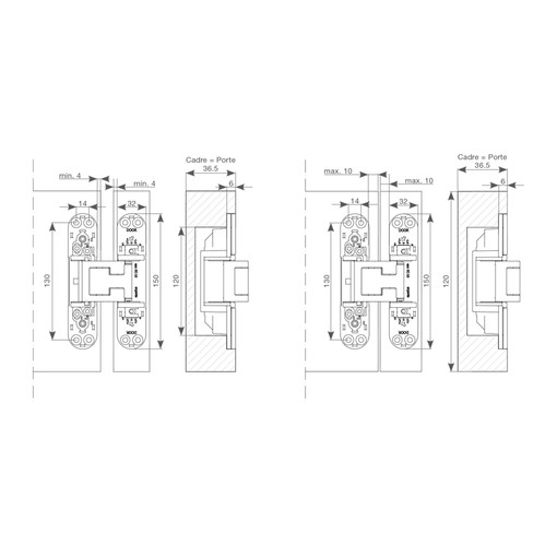 Charnière technique, conçue pour tourner au-delà d'une plinthe ou d'un revêtement mural, grâce à sa distance d'encastrement variable (de 4 à 10 mm) jusqu'à l'avant du panneau de porte.