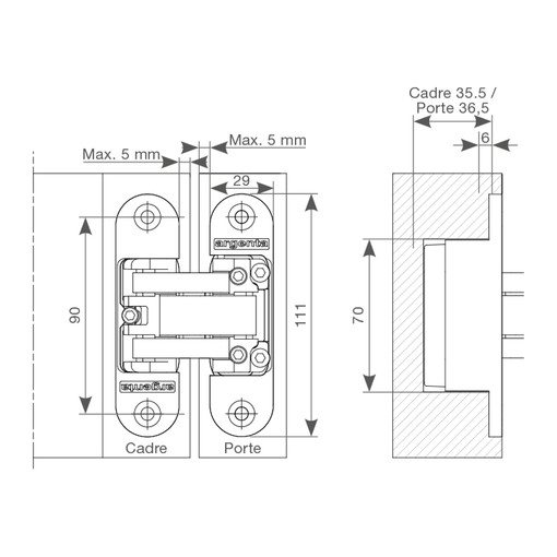 Profondeur d'encastrement 35,5 mm (cadre) / 36,5 mm (porte).