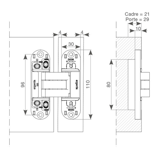 Charnière invisible TYO avec une profondeur d'encastrement minimale de 21 mm dans l'encadrement (29 mm côté porte), permettant l'utilisation d'encadrements étroits tout en conservant son aspect invisible.