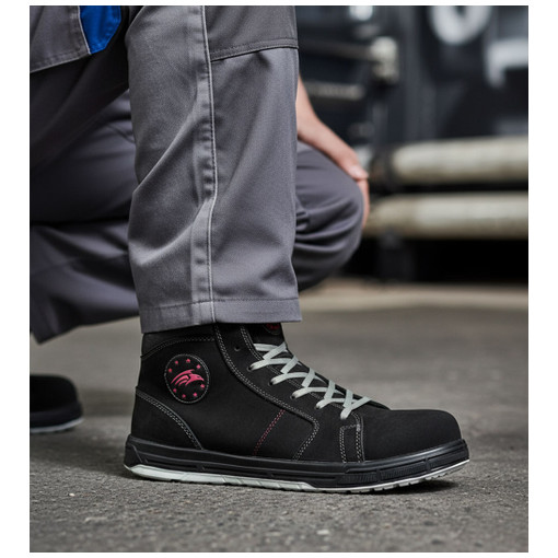 Chaussure de sécurité haute S3 SRC montante, solide et confortable, conçue en nubuck hydrofuge et cuir résistant à l’ abrasion.