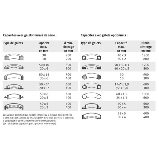 accessoires en option : affichage numérique, différents galets, rouleaux d'appuis spécifiques, dispositif à réaliser des spirales ou des torsades