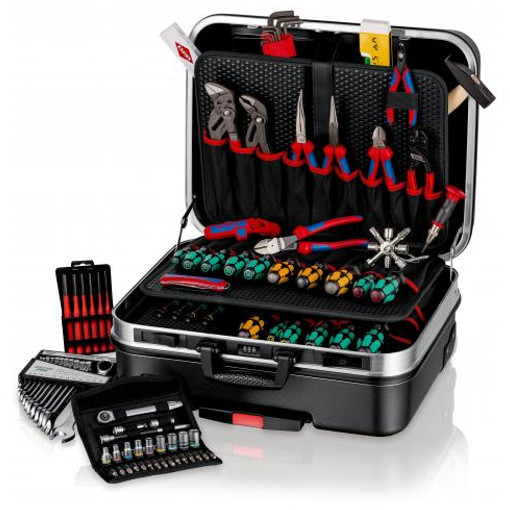 Mallette "Big Basic Move"90 outilsroulettes et poignée télescopiquecoque de fond rigide, porte documents, couvercle protecteur, cadre extérieur en aluminiumcomposition :1 x KNIPEX TwinKey® Clé universelle pour armoires de commande pour toutes les armoires et systèmes de fermeture standard1 x Couteau pliant d'électricien1 x KNIPEX ErgoStrip® Outil universel à dégainer (Ø 8,0 13,0 mm)1 x Pince demi-ronde avec tranchant (pince bec de cigogne)1 x Pince demi-ronde avec tranchant (pince bec de cigog [...]