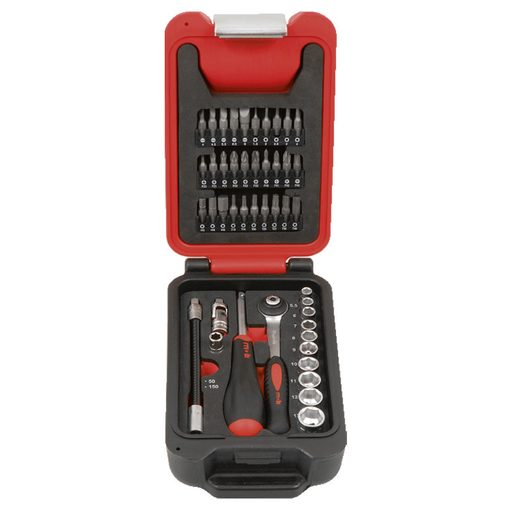 Coffret en PEHD : 135 x 215 x 60 mm mousse bicolore haute densité à cellule fermée contient : - 10 douilles : 5,5/6/7/8/9/10/11/12/13/14/mm - 1 cliquet 1/4'' - 1 cardan - 1 rallonge : 150 mm flexible - 1 rallonge : 50 mm - 1 poignée tournevis - 1 douille porte-embouts - 30 embouts variés : - 5 Fentes : 4/4,5/5,5/6,5/8 - 8 Hexagonaux : H1,5/H2/H2,5/H3/H4/H5/H6/H8 - 6 Pozidriv : PZ0/2xPZ1/2xPZ2/PZ3 - 4 Phillips : PH0/PH1/PH2/PH3 - 7 Torx : [...]