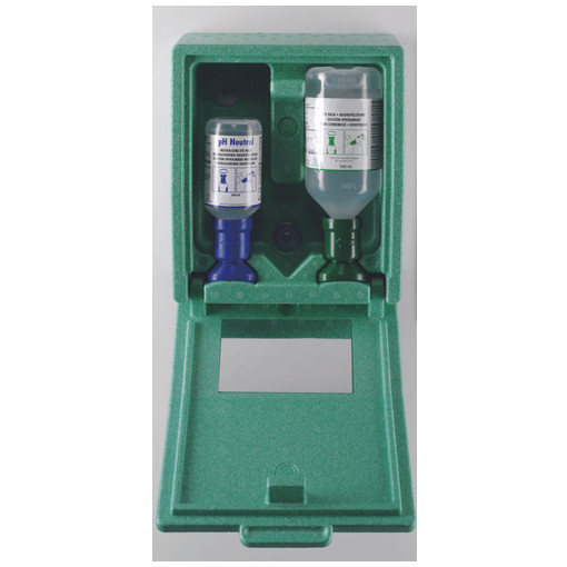 Convient pour un lavage des yeux en cas de projections d'acides ou de bases composition : - 1 lave '9cil 200 ml de solution PH neutre - 1 lave '9cil 500 ml de solution ophtalmique stérile(0,9 % de NaCI) - 1 support mural avec miroir la solution PH neutre neutralise les projections de solutions alcalines bases ou acides, stoppe les brulures et ramène le niveau de PH dans l''9cil à 7,4 en moins de 20 secondes le sérum physiologique permet de rincer l''9cil après utilisation du PH, température de cons [...]