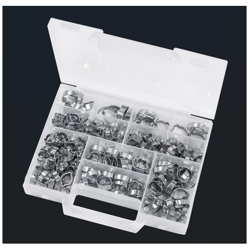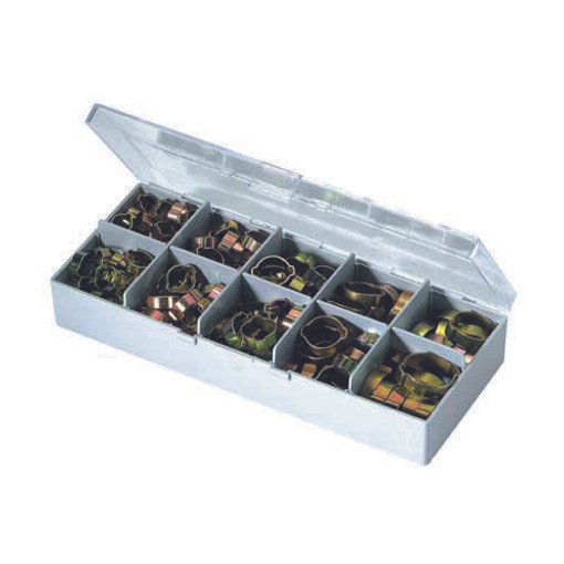 coffret plastique comprenant 210 colliers à oreilles type standard du Ø 9 - 11 mm à Ø 23 - 27 mm.