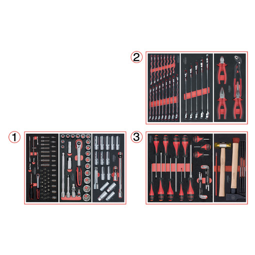 Empreinte des outils découpée au laser résistant aux huiles et produits chimiques mousse imputrescible composition : - 1 module de douilles et accessoires ULTIMATE® 1/4'', 54 pièces - 1 module de douilles et accessoires ULTIMATE® 1/2'', 24 pièces - 1 module de douilles longues et accessoires 1/2", 17 pièces - 1 module de clés mixtes ULTIMATE®, 17 pièces de 6 à 22 mm - 1 module de clés mixtes ULTIMATE®, 5 pièces de 24 à 32 mm - 1 module de pinces, 4 pièces - 1 module de vissage, 8 pièces [...]