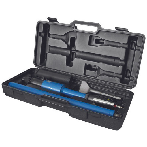 livré en mallette avec 1 burin plat largeur 70 mm, 1 rallonge 50 cm, 1 raccord rapide, 1 grip pour rallonge.