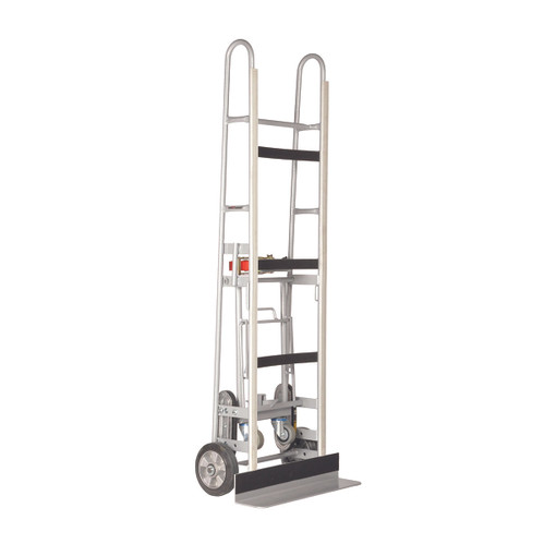 Construction robuste en tube d'acier et peinture finition époxy grise solution unique pour déplacer rapidement et sans effort les charges hautes, volumineuses ou lourdes sangle d'arrimage avec tendeur à crochet et rembobinage automatique pour une meilleure sécurité angle d'inclinaison 51° distance de la bavette à la sangle 72 cm roue avant Ø 200 mm à bandage caoutchouc moldon béquille escamotable à roulettes pivotantes Ø 80 mm en caoutchouc moldon système type chenilles pour franchir facilem [...]