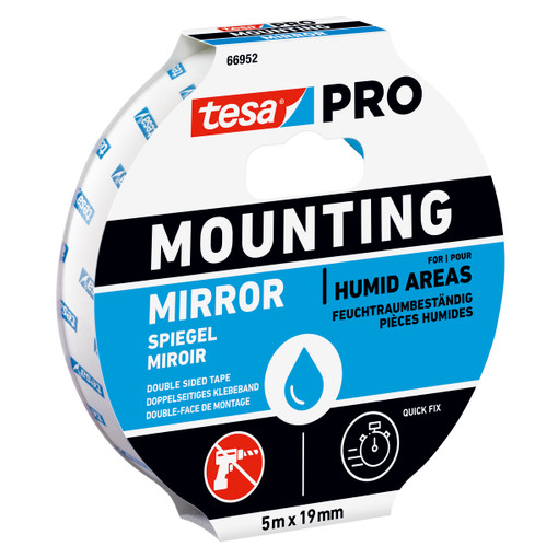 Ruban de fixation double face résistant à l'humidité, pour la fixation solide de miroirs sans vis, ni outils Adhère fermement et en toute sécurité même dans les environnements humides, convient particulièrement à l'application sur le carrelage de la salle de bain maintien fiable sans devoir percer des trous permanents : tesa PRO Fixation de miroir ne nécessite ni vis, ni prises ni même clous utilisation facile: : peut être découpé en petites ou grandes pièces individuelles pour obtenir une [...]