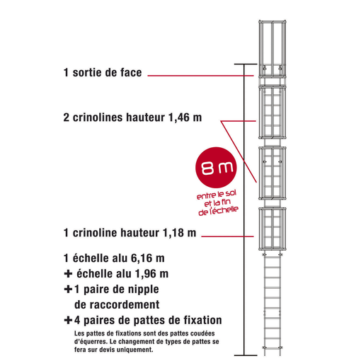 Echelle à crinolines aluminium standard : 1 volée(échelle, crinolines, nipples en fonction de la hauteur à équiper) 1 sortie de face 1 marche palière 1 portillon les pattes de fixation pour mur béton les échelles à crinoline sont des échelles d'accès leur utilisation doit être réservée à ce seul usage la pose doit être effectuée par des professionnels spécialisés et validée par un organisme officiel notre responsabilité couvre uniquement la fourniture du matériel pour des configurat [...]