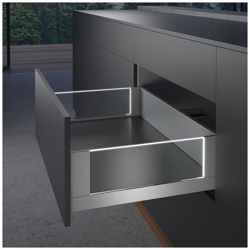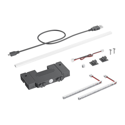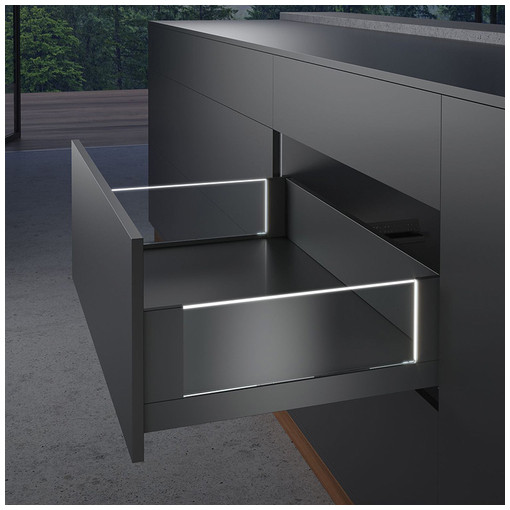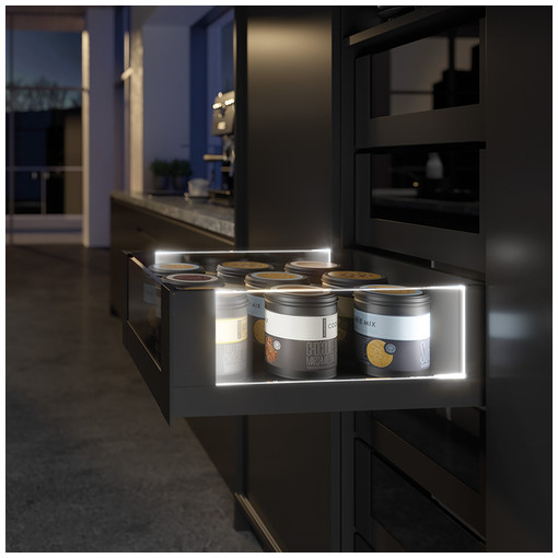 Eclairage de mise en valeur pour AvanTech YOU Inlay.Installation ultérieure possible.Lumière diffuse. 1 kit par tiroir, y compris 1 pack de piles rechargeables via micro USB.Eclairage automatique à l'ouverture et extinction automatique à la fermeture du tiroir.