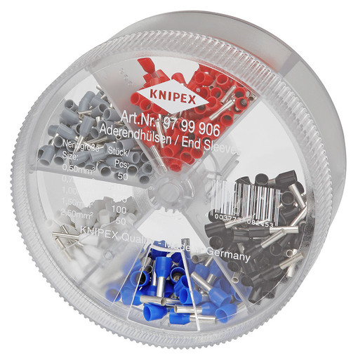 Boîtier distributeur maniable, transparent couvercle rotatif avec ouverture pour le prélèvement des différents embouts de câble avec embouts isolés selon le code couleur DINcomposition :97 99 907 : 4,00 mm² - AWG 11 - gris (x50) 6,00 mm² - AWG 10 - jaune (x20)10,00 mm² - AWG 7 - rouge (x20)16,00 mm² - AWG 12 - bleu (x10)97 99 906: 0,50 mm² - AWG 20 - blanc (x50) 0,75 mm² - AWG 18 - gris (x100) 1,00 mm² - AWG 17 - rouge (x100) 1,50 mm² - AWG 15 - noir (x100) 2,50 mm² - AWG 13 - bleu [...]