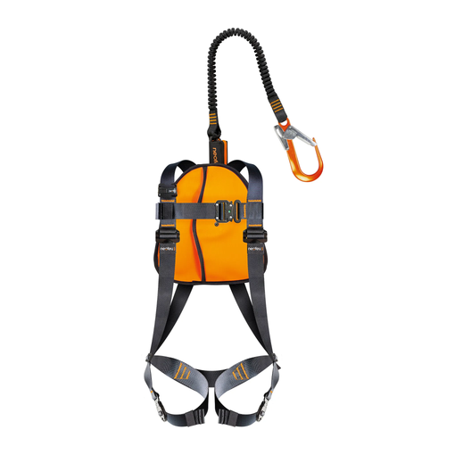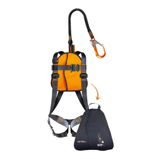 Harnais antichute : Sangles principales en polyester 44 mm (R=25kN). Sac réversible en néoprène fluo équipé d'un dosseret confort. Réglages des bretelles par le bas à l'aide des boucles rapides mâle/femelle en acier finition époxy noir. Sangle bavaroise 44 mm et cuissardes à fermeture par boucles automatiques acier finition zingué noir avec témoin de fermeture. Point d'accrochage dorsal sur D métallique. Boucles anti-garrot brevetées en acier finition époxy noir. Porte-longe amovible. Larg [...]