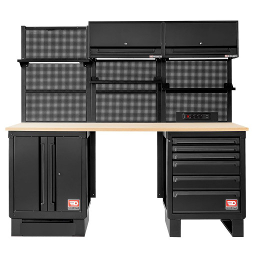 Solution ROLL Workshop System pour optimiser votre atelierstructure en tôle d'acier peinte époxycouleur : noir 9005composition :2 x RWS2-CHSPPBS : 2 coffres supérieurs avec porte1 x RWS2-MBS6TBS : meuble bas 6 tiroirs - 3 tiroirs hauteur 60 mm / 2 tiroirs hauteur 130 mm / 1 tiroir hauteur 200 mm1 x RWS2-MBSPPBS : meuble bas 2 portes pleines1 x RWS2-DRAWERBS : tiroir à placer sous le meuble bas6 x RWS2-PPAV1BS : 6 panneaux perforés - 6x6 mm par pas de 12 mm1 x RWS2-PPAV1USBBS : 1 pegboard avec powerbl [...]
