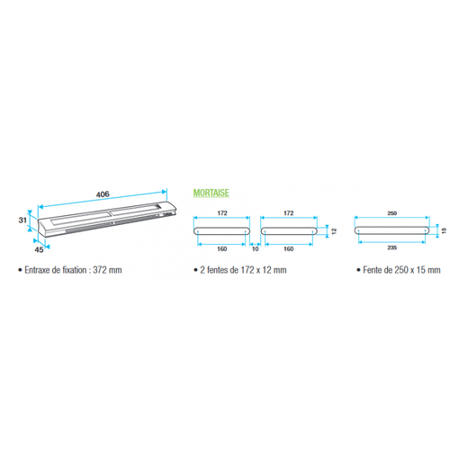 Domaine d'application: fente double 2 x (172 x 12) mm et fente simple: (250 x 15) mm.
