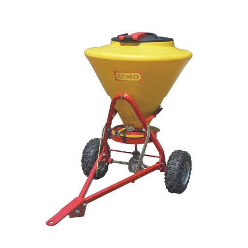 Châssis en acier laqué rouge roues gonflables avec pneumatique profil neige trémie en polyéthylène avec couvercle verrouillable à charnière, insensible à la corrosion réglage progressif et précis du débit et du faisceau d'épandage par manette renvoi d'angle renforcé avec pignons aciers et carter aluminium convient aux quads et microtracteurs (vitesse d'épandage limitée à 12 km/h manette de débrayage de l'agitateur granulométrie < 5 mn livré pré monté avec attelage utilisé du sel sec [...]