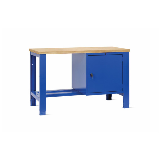 Tôle d'acier plié d'épaisseur 30/10e piètement profilé en «U» 90 x 50 mm longerons de renforts soudés 2 traverses de liaison 90 x 50 mm hauteur réglable avec plateau : 850 ou 900 mm fixation au sol possible caisson 1 porte avec 1 étagère réglable en hauteur, dimension (L x P x H) : 600 x 690 x 625 mm fermeture du caisson par serrure à clés coloris bleu RAL 5010.