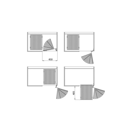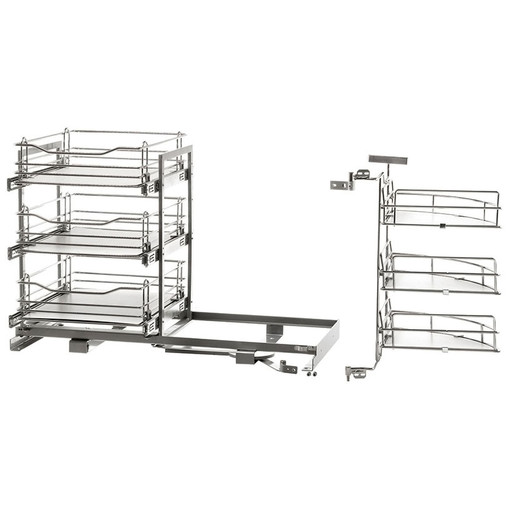 Cette ferrure permet un accès total au contenu des paniers. L'ouverture de la porte entraîne les paniers rectangulaires face à l'ouverture. Ces paniers sur coulisses à sortie totale sont ensuite extractibles individuellement. La fermeture de la porte les entraîne dans l'angle mort du caisson. Mécanisme d'angle pour meuble de 900 mm avec porte de 450 mm. Les coulisses sont équipées d'un rappel en fin de course. Coulisse sortie totale. Nécessite des charnières 165° sur la porte. Livrée complèt [...]