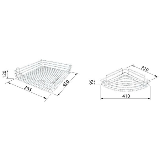 3 corbeilles d'angle 320 x 320 mm, hauteur 95 mm Profondeur intérieure de caisson mini : 486 mm Hauteur intérieure de caisson mini : 485 mm