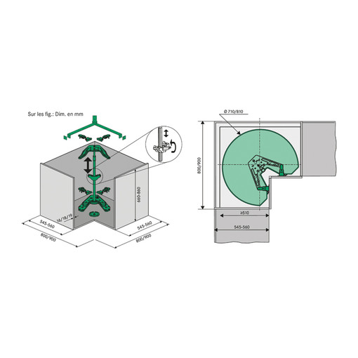 Utilisables dans caisson d'angle de 800 ou de 900 mm.