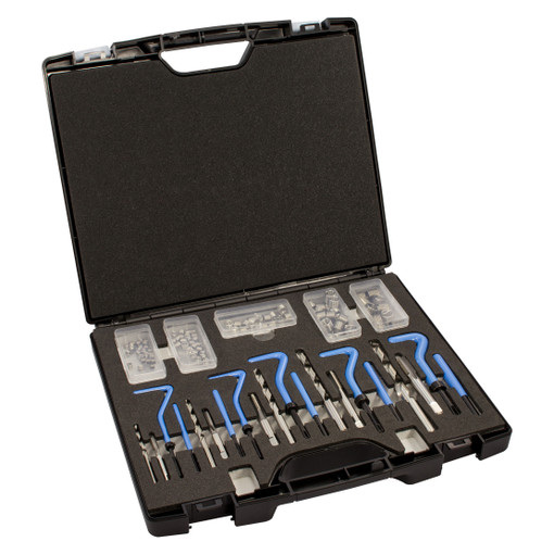 coffret comprenant : 1 taraud, 1 foret, 1 appareil de pose, 1 rupteur et les filets pour chaque Ø suivant : M5 x 0.8 - M6 x 1.0 - M8 x 1.25 - M10 x 1.5 - M12 x 1.75.
