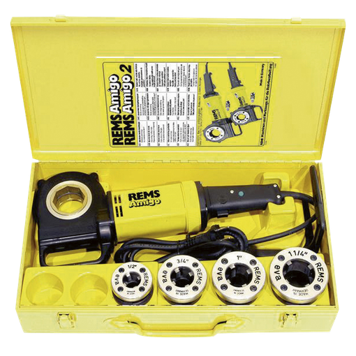 Filière électrique filairel a plus petite, la plus légère et la plus rapide jusqu au Ø 1'bc''c apacités :t ubes acierdiamètre 1/8'' - 1 1/4''t rès compacte et très légère (3,5 kg)m oteur puissant 1200 W, à couple élevé et 2 sens de rotationv itesse de coupe très élevée 35 27 min-1v errouillage sûr des têtes sur la filière, amorçage facilef ourchette d arrêt avec vis de serrage à effet auto-renforçant, maintien sûr du tubel ivrée avec 4 têtes de filetage conique droite (BSPT) : [...]