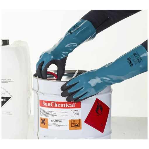 Protège contre les substances chimiques suivantes : Méthanol (niveau 2, >30 minutes), n-Heptane (niveau 3, >60 minutes), Hydroxide de sodium 40% (niveau 6, >480 minutes) et Acide sulfurique 96% (niveau 2 >30 minutes).