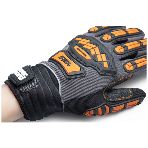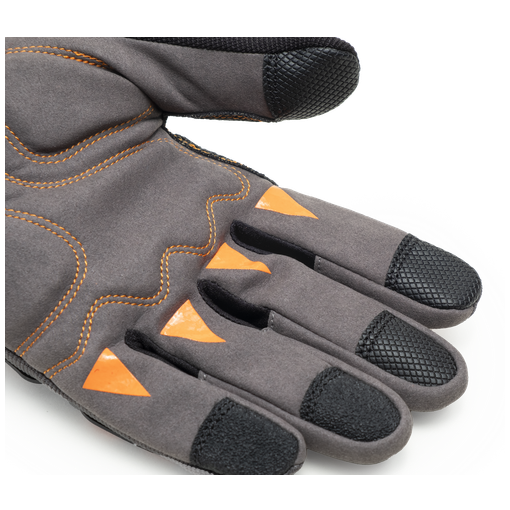 Paume en tissu microfibre gris et dos en polyester gris, paume rembourrée, inserts TPR anti-impact sur le dos de la main et des doigts ; index majeur et pouce grip PU tactile/écran, poignet néoprène avec fermeture velcro.