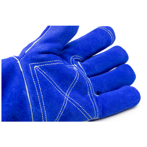Gants EUROWELD 360, Croûte de vachette bleue, coutures Kevlar , Pouce palmé, Intérieur molletonné, Renfort paume en cuir bleu, protège artère, Manchette de sécurité en cuir croûte, longueur : 15cm.