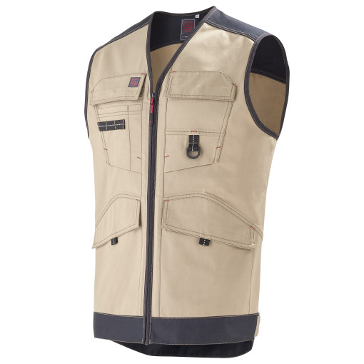 Emmanchures, encolure et milieu devant bordés de biais renfort intérieur épaules et empiècement dos fermeture centrale zippée et cachée bord-à-bord poches poitrine à rabat fermé par grippers cachés et avec soufflet bas, dont une avec surpoche et sangle porte-outils avec détail rétro réfléchissant et l'autre avec tresse porte-boucle poches basses passepoilées à rabat fermé par grippers pattes de réglage au niveau de la ceinture bas dos dépassant composition : 65% coton 35% polyester - 2 [...]