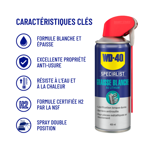 Homologué NSF H2 N°145376 (utilisation possible en industrie alimentaire). Bénéficie d'une formule épaisse procurant une lubrification longue durée ne coule pas et reste adhérente sur le support réduit les coefficients de friction et facilite le fonctionnement des pièces métalliques en mouvement utilisable sur des mécanismes supportant de fortes charges, en intérieur comme en extérieur résiste à des températures pouvant aller de -18°C à +145°C recommandé pour roulements, treuils, loque [...]
