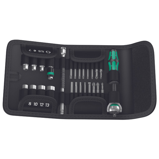 Pochette pliante Composition : 1 cliquet Zyklop à emmanchement 1/4" 7 douilles Zyklop (métriques) 1 rallonge Zyklop (longue) avec bague de rotation rapide 1 adaptateur 16 embouts de 50 mm : - 8004 A : 1/4 x 152 mm - 8784 A1 : 1/4 x 37 mm - 8794 LA : 1/4 x 150 mm - 851/4 TZ PH 1 - 2 - 3 x 50 mm - 855/4 TZ PZ 1 - 2 x 50 mm - 867/4 Z Torx 10-15-20-25-27-30 x 50 mm - 800/A Z : 1x5 - 5x50 - 840/4 Z Hex-Plus: 4 - 5 - 6 x 50 mm - 8790 HMA : 5,5 - 6 - 7 - 8 - 10 - 12 - 13 x 23mm. [...]