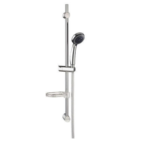 Conforme à la norme NF ACS. Kit complet Barre Ø 1,8 cm en inox chromé Patères murales réglables (hauteur : 70 cm) Support de douchette : 1 position en ABS Porte savon transparent Douchette 5 jets : pluie, pluie dense, massage, pluie + pluie dense et pluie + massage - Ø 8 cm Consommation d'eau : 11 L/mn Changement de jet rotatif Picots anticalcaire Flexible PVC Soft blanc/chromé Longueur 1m50 Résiste à 30 Kg de traction Écrou de robinetterie en laiton chromé Écrou de douchette en ABS chromé. [...]