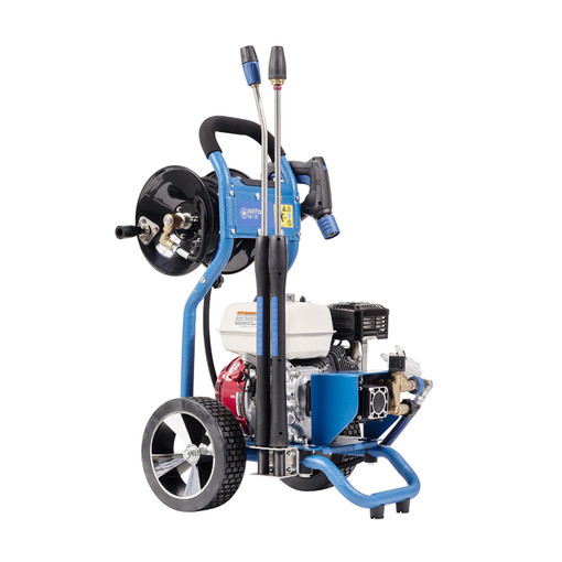 Châssis compact en acier laqué type "diable" avec roues increvables capot de protection de pompe de série valve thermique de sécurité pour préserver la pompe pression réglable à la lance injecteur de détergent basse pression avec crépine d'aspiration support de lances intégré au châssis équipé en série d'un pistolet Ergo 2000 à couplage rapide des accessoires, enrouleur de flexible HP 15m, lance HP inox à couplage rapide et pression réglable munie d'une buse HP "Tornado Plus", seconde [...]