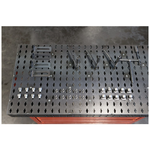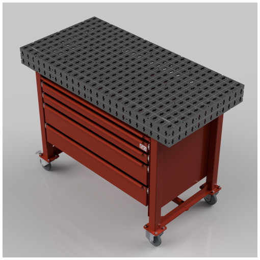 -1 table de soudure 1200 x 600 x 100 mm intégrée sur la servante 4 tiroirs. 4 roulettes Ø 100 mm dont 2 avec frein.